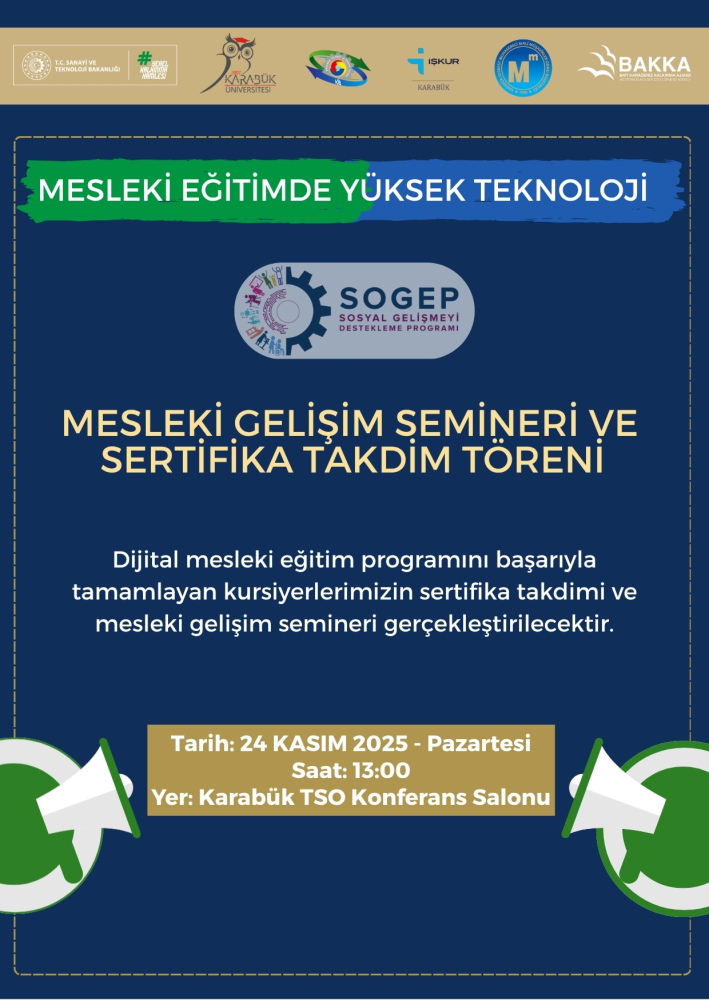 MESLEKİ EĞİTİMDE YÜKSEK TEKNOLOJİ projesi kapsamında düzenlenen Mesleki Gelişim Semineri ve Sertifika Takdim Töreni, 24 Kasım 2025 Pazartesi günü saat 13.00’te Karabük TSO Konferans Salonu’nda gerçekleştirilecektir. 🎓💻