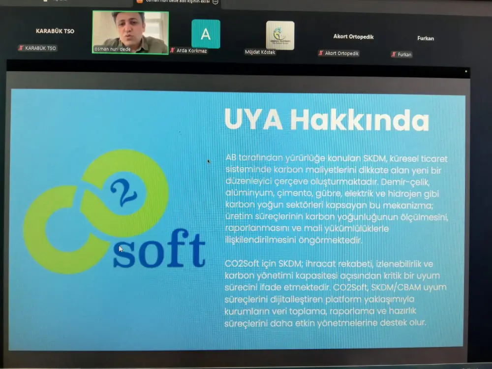 Karabük Ticaret ve Sanayi Odası (KTSO) ile CO2SOFT iş birliğinde düzenlenen “Sınırda Karbon Düzenleme Mekanizması”(SKDM) konulu webinar çevrimiçi olarak gerçekleştirildi.